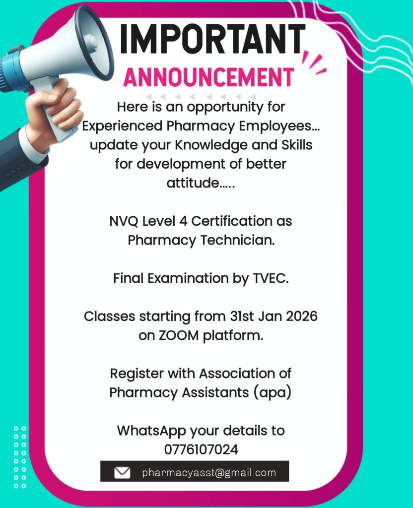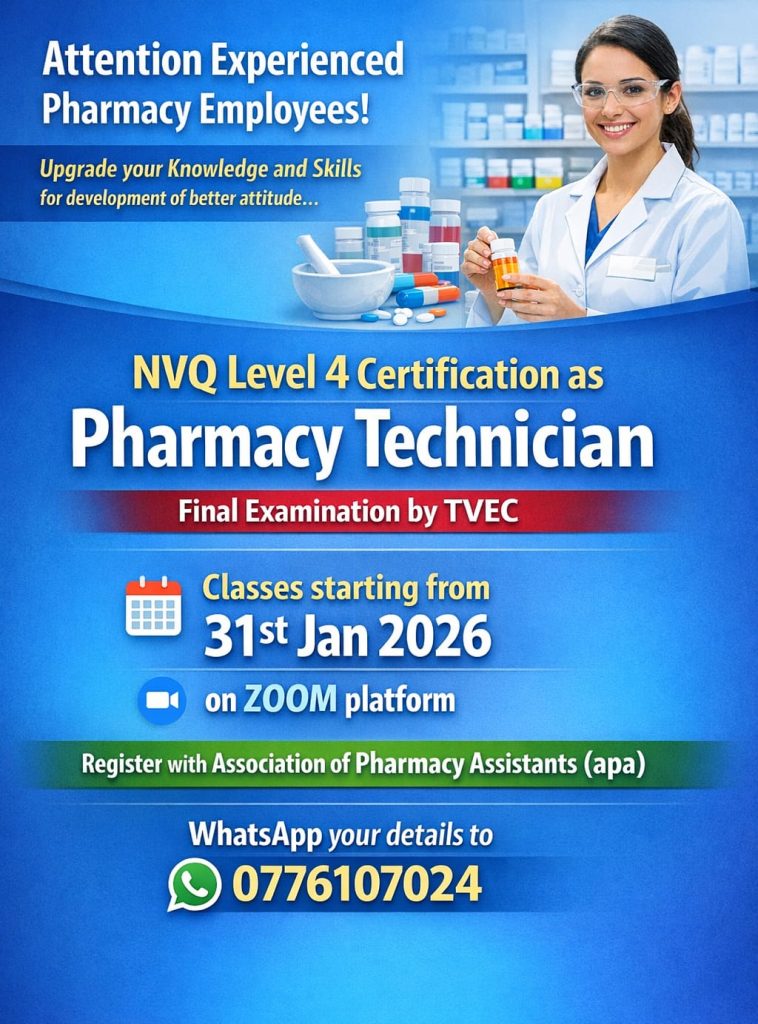 Representation to Ministry of Health / CMCC on admission of Pharmacy Technician as Apprentice Pharmacist.