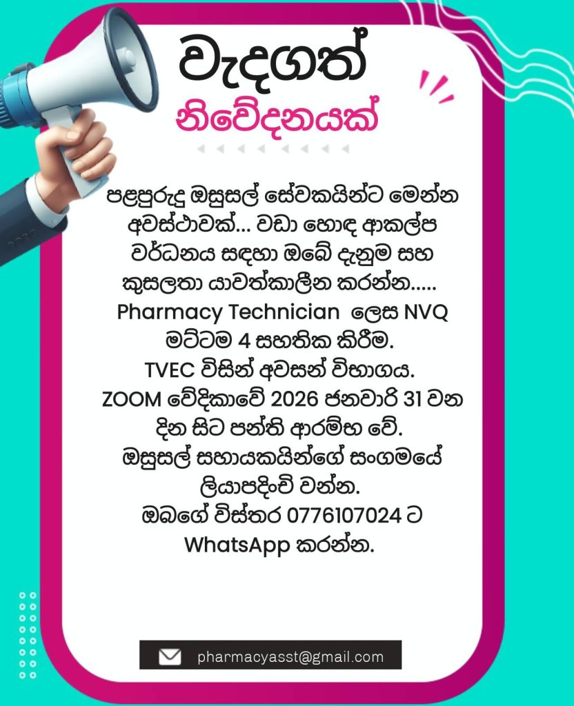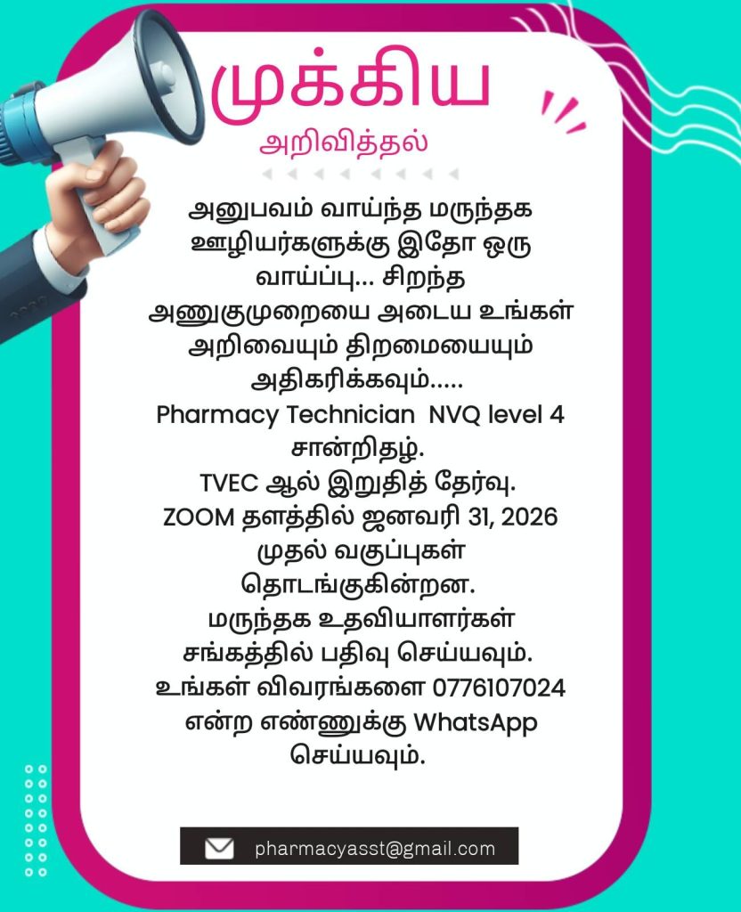 வங்கி ரசீதில் உங்கள் பெயர் மற்றும் மருந்தகத்தின் பெயர் மற்றும் முகவரியை எழுதி, வங்கி ரசீதை Whatsapp மூலம் எங்களுக்கு அனுப்பவும்: 0776107024